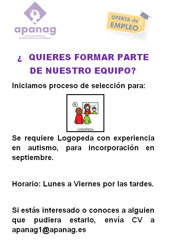 Buscamos Logopeda para nuestra asociación en Guadalajara, si estas interesado o conoces a alguien que los está ponte en contacto con nosotros en apanag1@apanag.es.