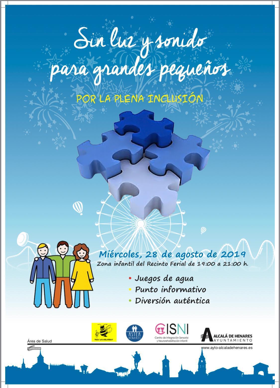 Gran iniciativa del Ayuntamiento de Alcalá de Henares el miércoles 28 de agosto en la zona infantil del recinto ferial de 19:00 a 21:00 podremos disfrutar de dos horas sin luces ni sonidos para grandes y pequeños por la plena inclusión de las personas con TEA 💙💙💙💙